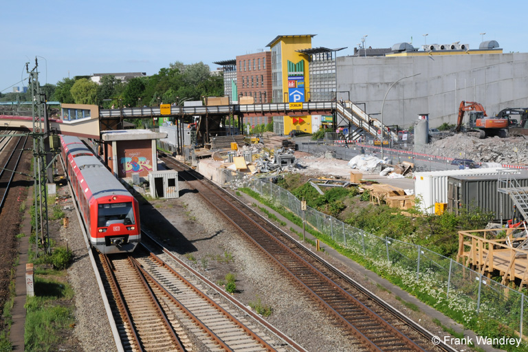 Ein Blick in nördlicher Richtung des Wilhelmsburger Bahnhofs. Das Eingangsgebäude ist nicht mehr vorhanden. Mit einer Behelfsbrücke erreicht man jetzt den Bahnsteig. Die Treppen sind sehr steil so dass ungeübte Treppensteiger schon mal leicht aus der Puste kommen.