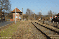 Die Bahnhofseinfahrt von Eldena. Aus dieser Richtung kamen die Züge aus Ludwigslust. Der Bahnhof ist zweigleisig und besitzt einen Inselbahnsteig. Zugkreuzungen haben hier nicht mehr stattgefunden. Die Ausfahrtsignale wurden bis zu diesem Zeitpunkt noch nicht abgeschaltet. Sie stehen auf Rot. |