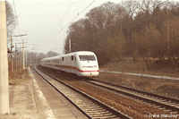 Eines der ersten ICE-Züge die auf der Strecke Hamburg-Berlin verkehren. Dieser Zug der im Mai 1999 den Bahnhof Aumühle durchfährt trägt den Namen "Fliegender Hamburger" der 1932 eine Fahrtzeit von Hamburg nach Berlin 2 Stunden und 18 Minuten benötigte. Als diese Aufnahme im Sommer 1999 gemacht wurde, war der Streckenausbau nach Berlin noch in der Anfangsphase. Die erste Maßnahme war, die Strecke unter Fahrdraht zu setzen. Bis diese Züge mit einer Reisegeschwindigkeit von mehr als 200 Km/h von Hamburg nach Berlin fahren können, werden noch einige Jahre vergehen. Bis es soweit ist, wird der ICE nicht wesendlich von der Historischen Fahrzeit abweichen.
